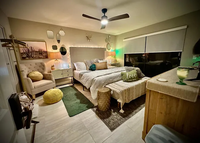 Bu villa donanımlı mini mutfak ile donatılmıştır. Palm Springs Uluslararasi havaalanına arabayla 26 dakika içinde ulaşmanız mümkündür. Güneş terasına, verandaya, piknik alanına doğrudan erişim vardır.